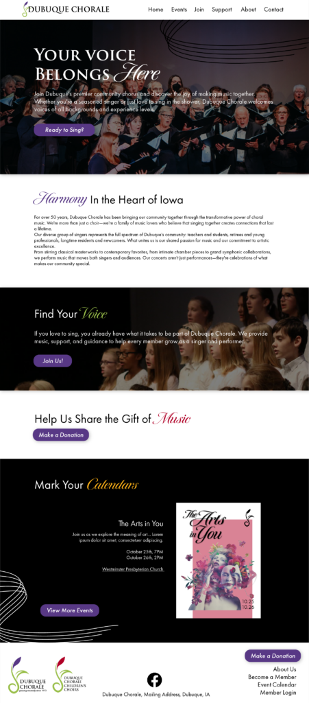 Project: Updated logo color palette, website design and development (www.dubuquechorale.org), and banner design.